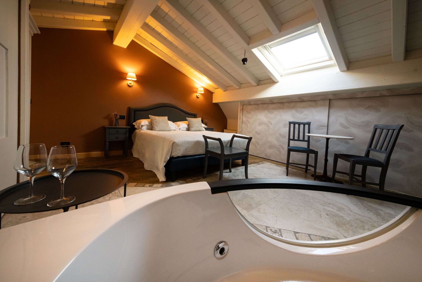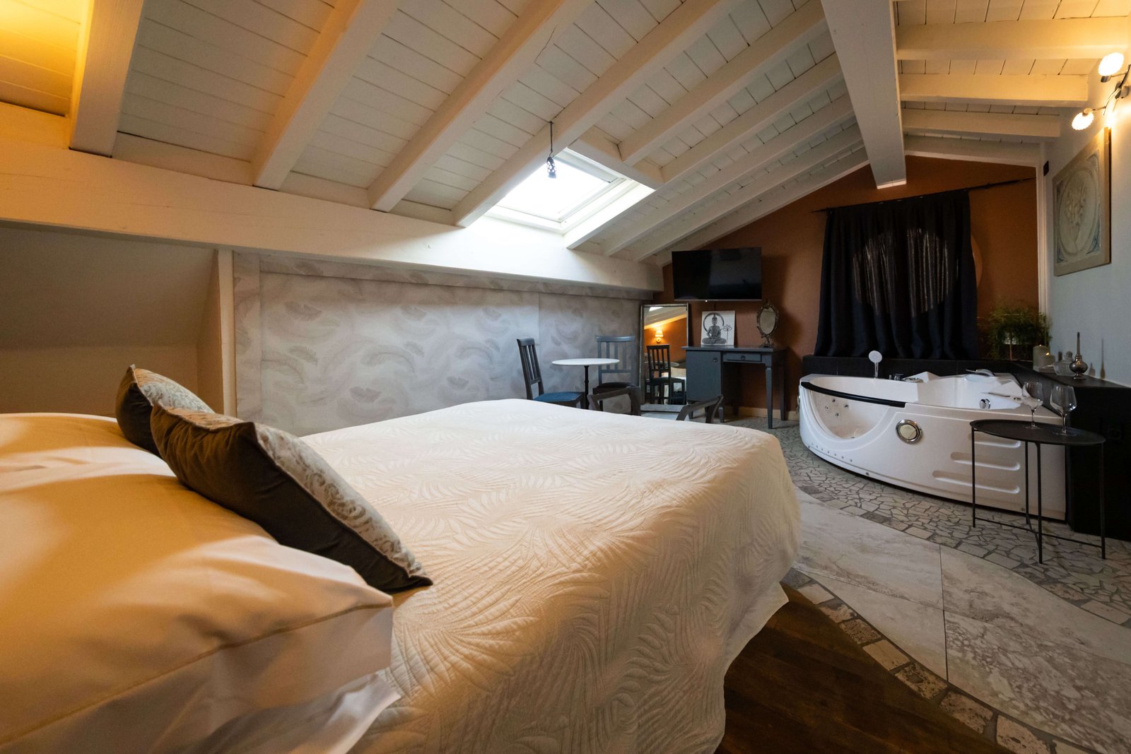 La Suite Mansarda con Vasca idromassaggio in camera, situata al secondo piano e raggiungibile solo tramite scale, dispone di: Ampia camera mansardata con travi in legno a vista, pavimento in parquet/marmo, Letto matrimoniale, Wi-Fi gratuito, Smart TV con digitale terrestre, bollitore elettrico con Tè e Tisane, cassaforte uso gratuito, armadio, piccola scrivania con minibar, specchio figura intera riscaldamento/aria condizionata con controllo autonomo, solo Non Fumatori.